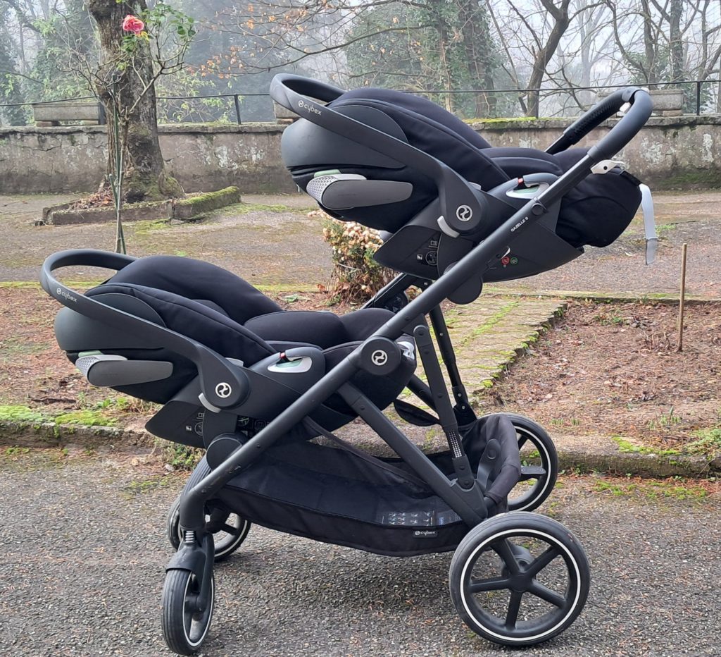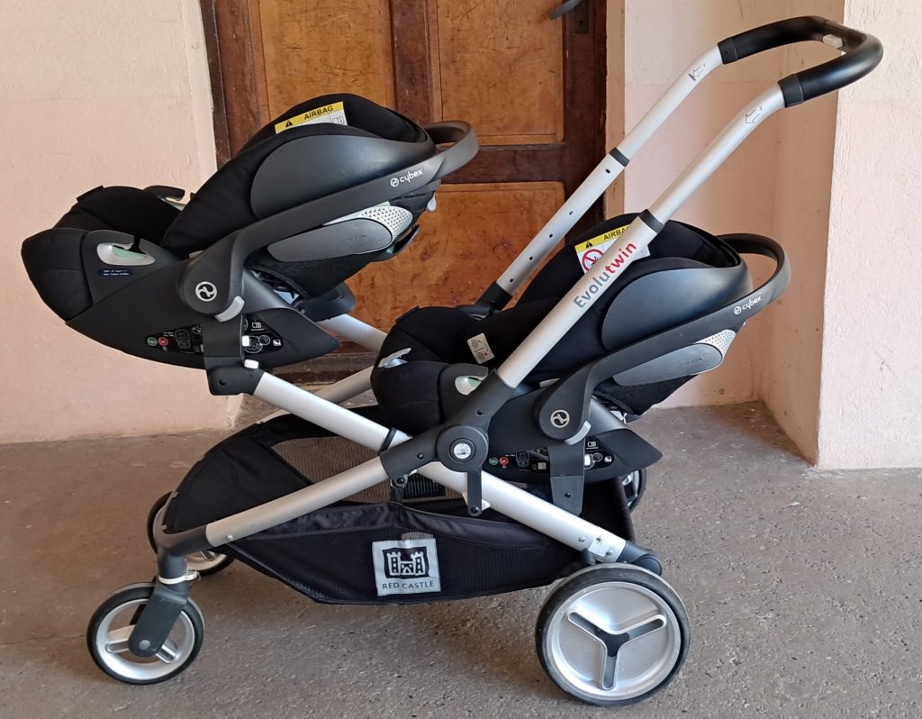 Mise à disposition d’une poussette double avec 2 cosys et adaptateurs cosys-poussette : 25 € / mois.